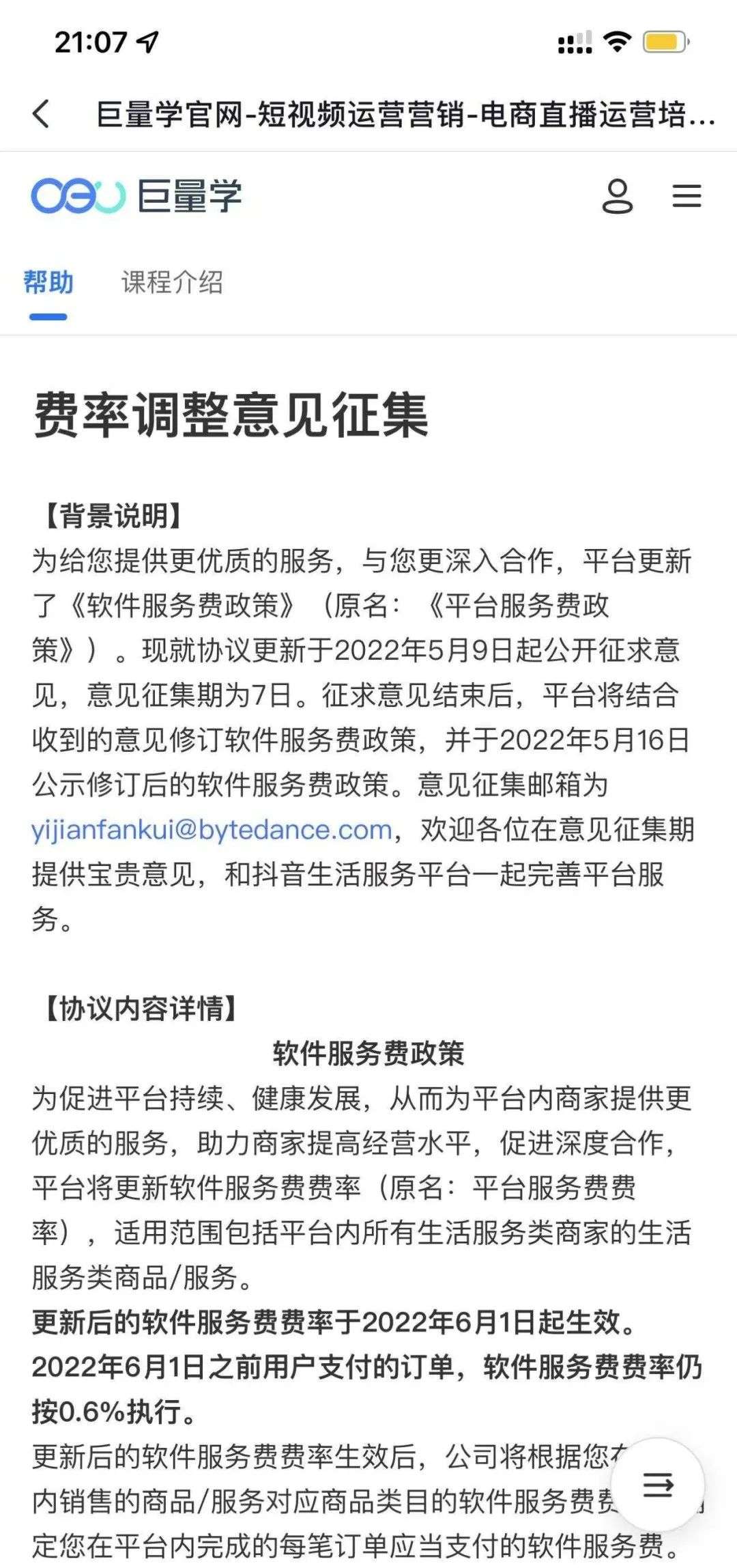 日前,巨量学(字节跳动旗下数字化教育培训平台)官网发布《费率调整意见征集》,指出抖音平台更新了《软件服务费政策》(以下简称《政策》),更新后,住宿、游玩、休闲娱乐等多类生活服务类商家的软件服务费率将会有不同程度的上调。