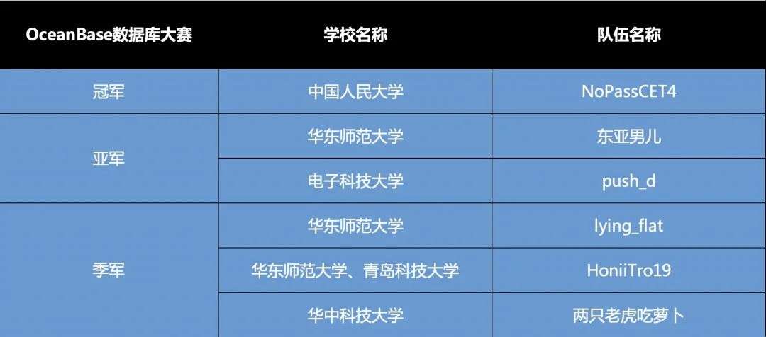 带着这样的愿景,来自中国人民大学的“NoPassCET4”、华东师范大学的“东亚男儿队”、中国电子科技大学的“push_d_”等20支队伍冲进“OceanBase 数据库大赛”决赛圈。
