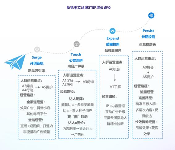 通多大量的案例分析,《白皮书》总结梳理出了新锐美妆品牌通用的增长路径及营销方法。简单来说就是通过 “STEP”(Surge-Touch-Expand-Persist)增长路径在抖音电商落地生根,同时借助品牌自播、达人矩阵、平台活动的组合,实现营销推并夯实市场地位。