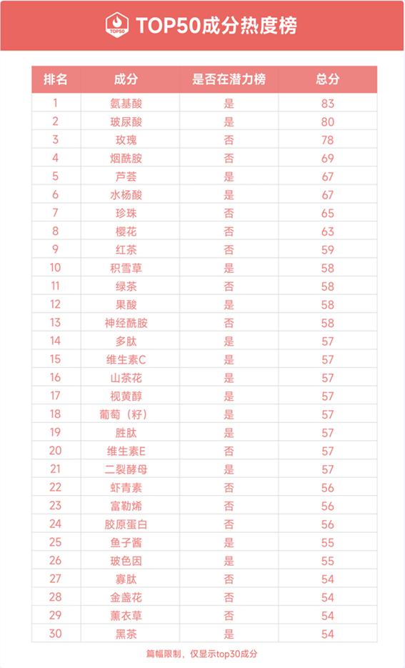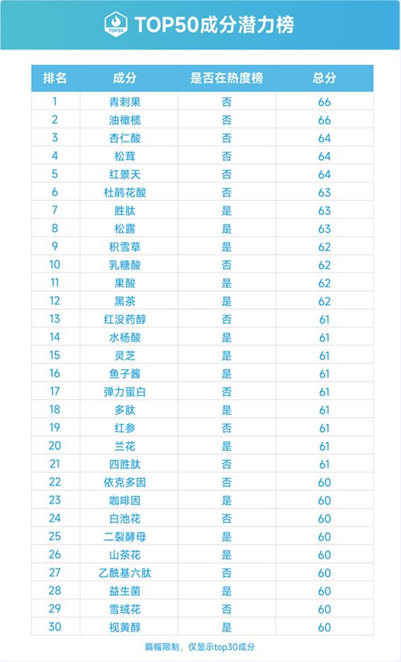 通过数据可以发现,氨基酸、玻尿酸、玫瑰、烟酰胺等是当下具有高热度的美妆成分;而青刺果、油橄榄、杏仁酸、松茸等最具潜力的美妆成分,往往尚未被广泛挖掘,而这些潜力成分或许也将是新锐品牌的产品机会点,值得品牌重点关注。