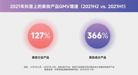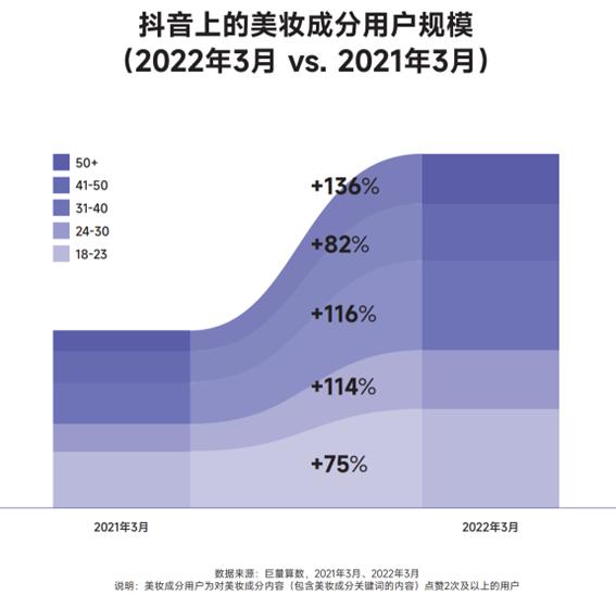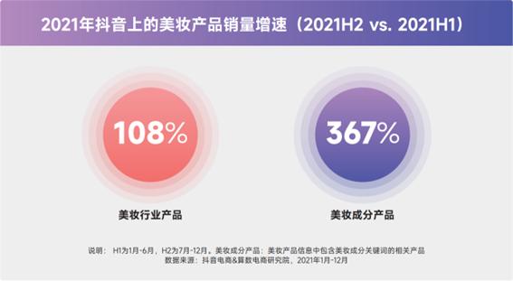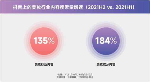 根据算数电商研究院数据,2021年下半年与上半年相比,抖音上的美妆行业内容搜索量环比增速135%,其中美妆成分内容的环比增速184%,超过行业大盘,说明有关“成分”的内容更加受到了用户的主动关注。