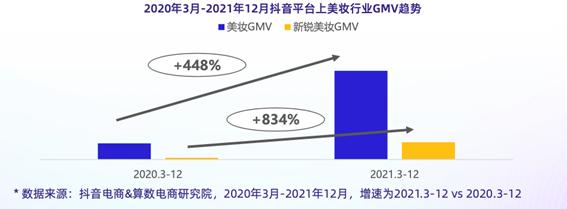 通过GMV的维度来观察也能够得到同样的结果,根据《白皮书》数据2021年3-12月,新锐美妆GMV同比增长超8倍,而美妆整体GMV同比增长超4倍,抖音电商已经成为新锐美妆品牌的重要成长阵地。