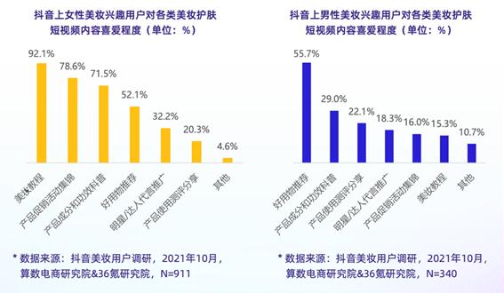 但男女用户在美妆内容偏好上有着比较明显的区别,根据《白皮书》结果显示,男性用户更加喜欢好物推荐类的视频内容,整体上偏向“结果导向”和“理性”,而女性用户更喜欢美妆教程、促销活动类的视频内容,更加偏向于“体验导向”与“感知”。