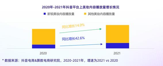 同样,也正是兴趣电商新模式的开辟,让大量新锐美妆品牌与传统美妆具有站在同一起跑线上,从而获得了难得的发展机遇。根据《白皮书》数据,2021年抖音上的新锐美妆相关内容播放同比增长42.6%,同比显著超过其他美妆内容播放量。