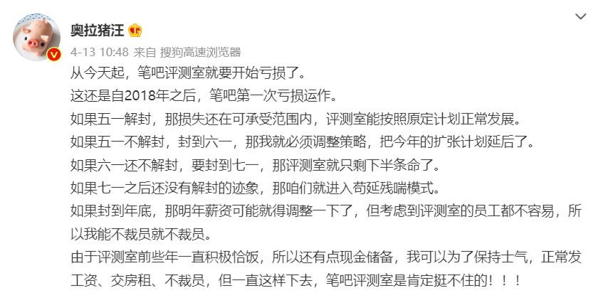 4月13日,他在个人微博账号“奥拉猪汪”提到,“这是2018年之后,笔吧第一次亏损运作……一直这样下去,笔吧是肯定挺不住的”。