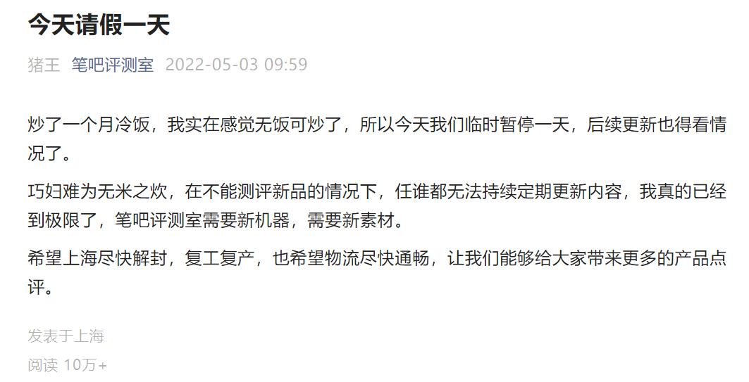5月3日,“笔吧评测室”发布一条标题为《今天请假一天》的推送,表示不能测评新品的情况下,任谁都无法持续定期更新内容,自己需要新机器,需要新素材。