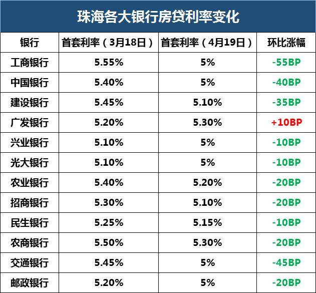 2月份的时候,珠海就经历过一波利率下调,当时珠海银行的首套房贷利率,从5.6%-5.8%下调到了5.4%-5.5%。