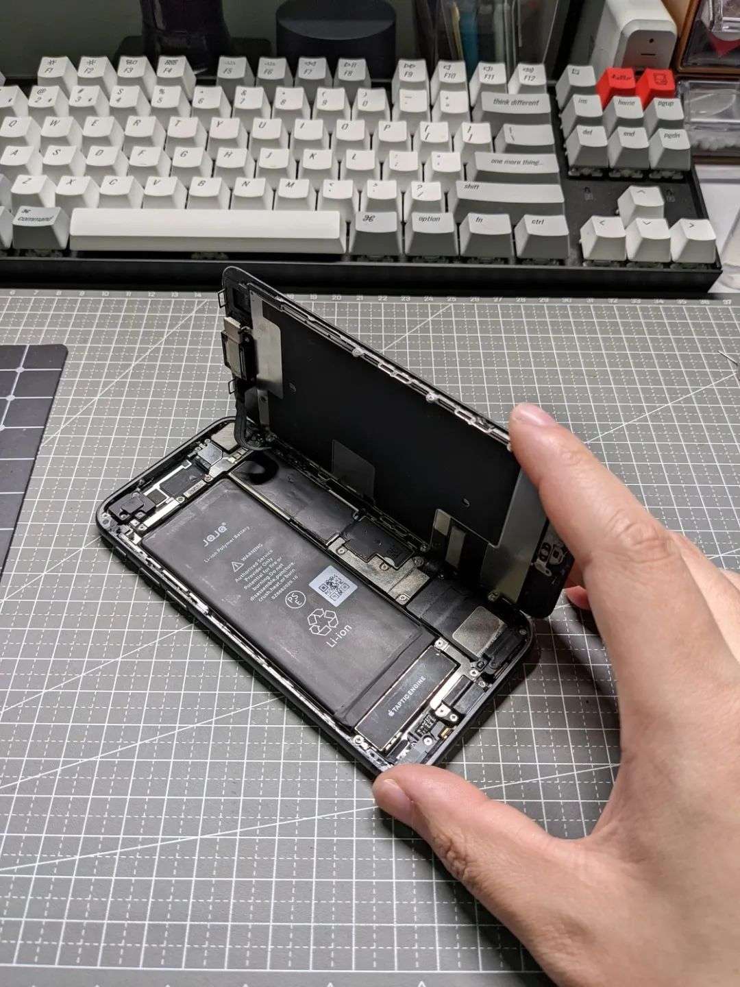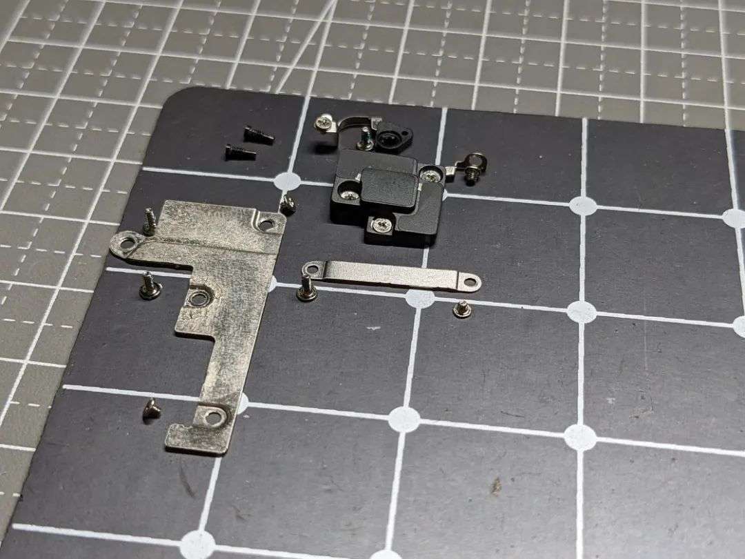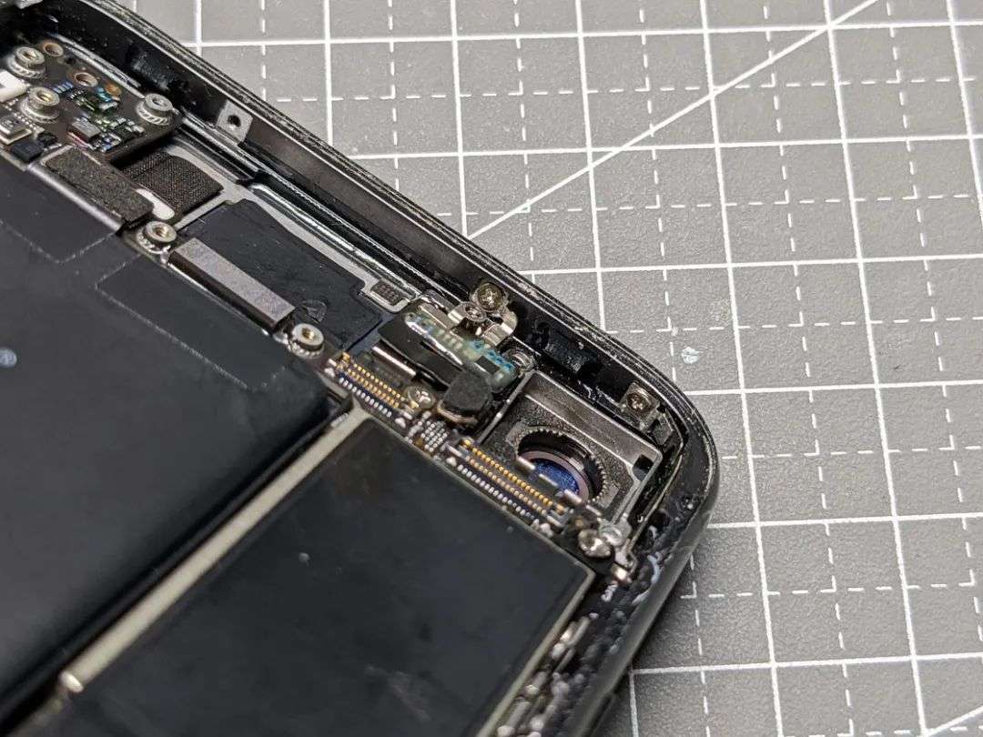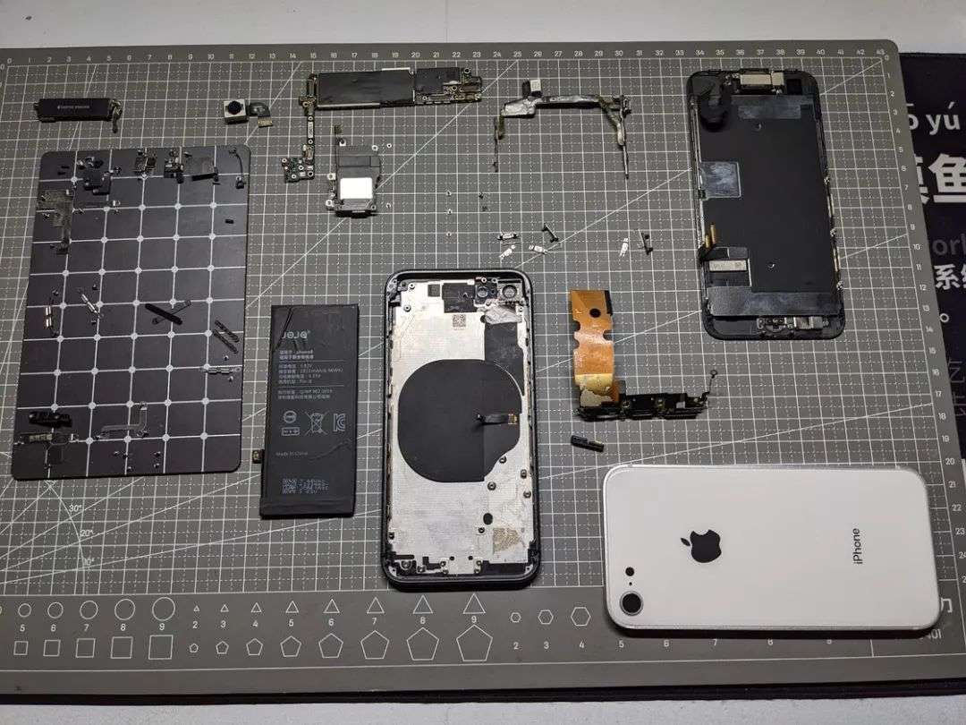 我们的目的很明确:把 iPhone 8 屏幕之下所有的零件拆出来,转移到新的后壳总成里面,再把屏幕装回去。这其中不仅包括了主板、电池、振动马达、相机模组等等常见的零件,也别忘了尾插、电源音量排线、屏幕支架卡扣,甚至是扬声器开孔内部的防尘网与塑料塞。