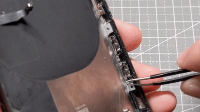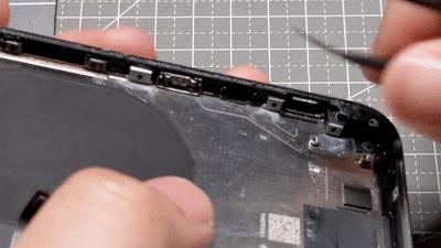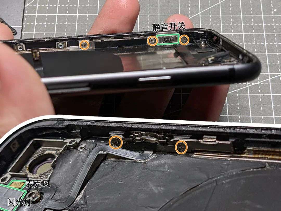 对于 iPhone 8 来说,尾插被拆下之后机身内的大零件就只剩下了机身上半段的电源 / 音量 / 静音开关排线。这根排线同时连接着镜头闪光灯以及后置麦克风,在初次拆卸的时候需要尽量用塑料撬棒从底部把粘胶分开。拧下电源键一侧的两颗螺丝、音量 / 静音开关一侧的三颗螺丝之后,就可以将 iPhone 的侧面按键总成完全取下——静音开关会跟着侧键排线一起被取下,按键则会留在边框上。除此之外,也别忘了用镊子把后置麦克风的防尘网从机身背面捅出来,转移到新的后壳总成上。