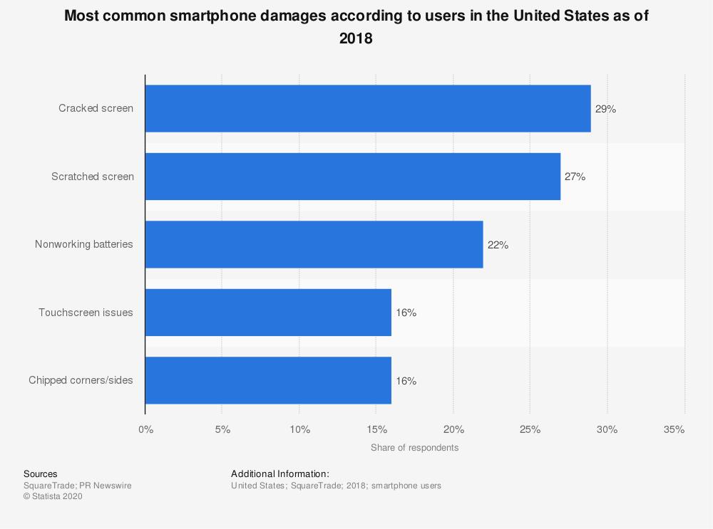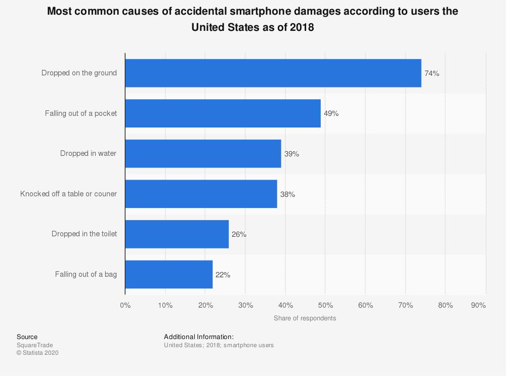 根据 Statista 收集到的关于 2018 年全美智能手机损伤的统计数据可以看出,「屏幕」「电池」和「机身」三处部件包揽了最常见的五种手机损伤。而在造成这些损伤的原因中,涉及到「摔落」的情形更是在六项中占了四项: