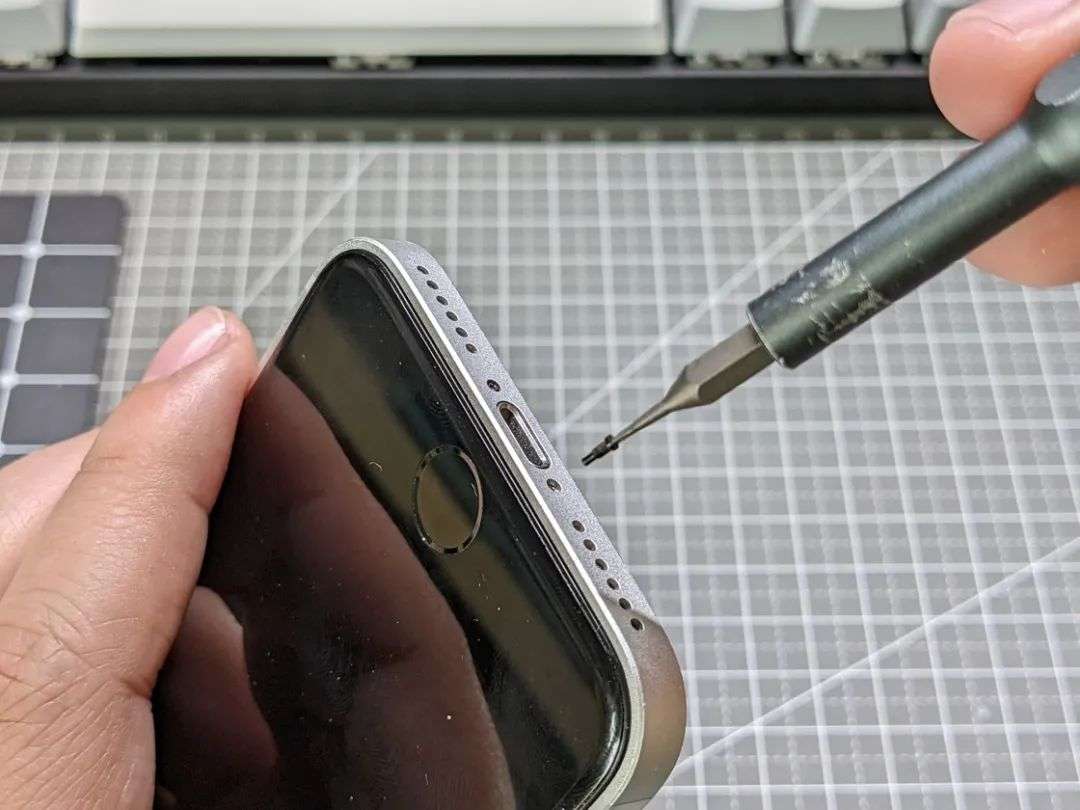 尽管摄像头的数量按年景不一而足, iPhone 在结构设计上的传承性却是有目共睹的,这两颗自从 2008 年的 iPhone 3G 便开始陪伴我们的底部螺丝自然是拆卸的第一步,用 P2 五角螺丝刀拧下来之后就可以放到收纳垫上,直到换装彻底结束之后才会再次用到它们。