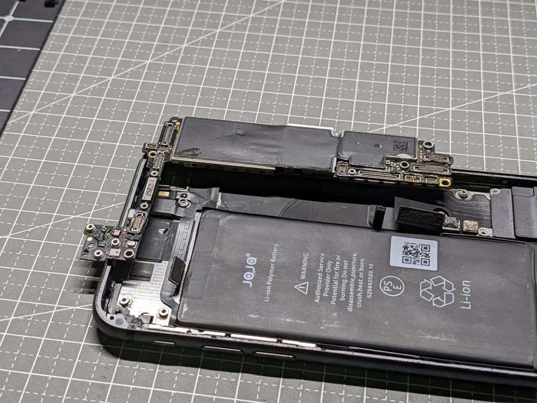 将屏幕拆下来之后,我们就可以很清晰的看到这台 iPhone 8 的内部结构了。实际上,即便是现在相对集成度最高的 iPhone 13 Pro ,其内部的主要功能结构也依然就是这些,区别主要在于布局的变化、天线的集成度提升,以及顶部扬声器和生物识别模组从屏幕总成上转移到了机身内。