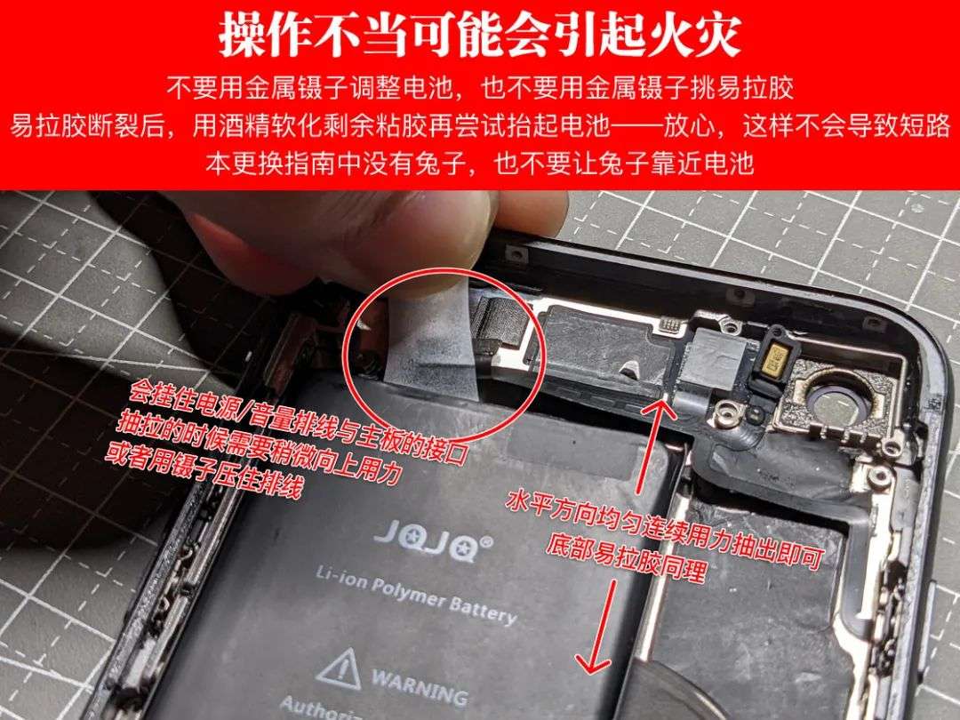 这样的分布式设计相比 iPhone 7 上面与电池等长的易拉胶提供了更高的容错空间——也就是当你不幸拉断其中的一条或几条的时候,余下更小的粘性允许你在不导致电池严重变形的前提下强行将电池撬出来——不过你最好还是别撬。搭配酒精和拆机片,一点点把易拉胶软化后再将电池抬出来是最安全的解决方案。