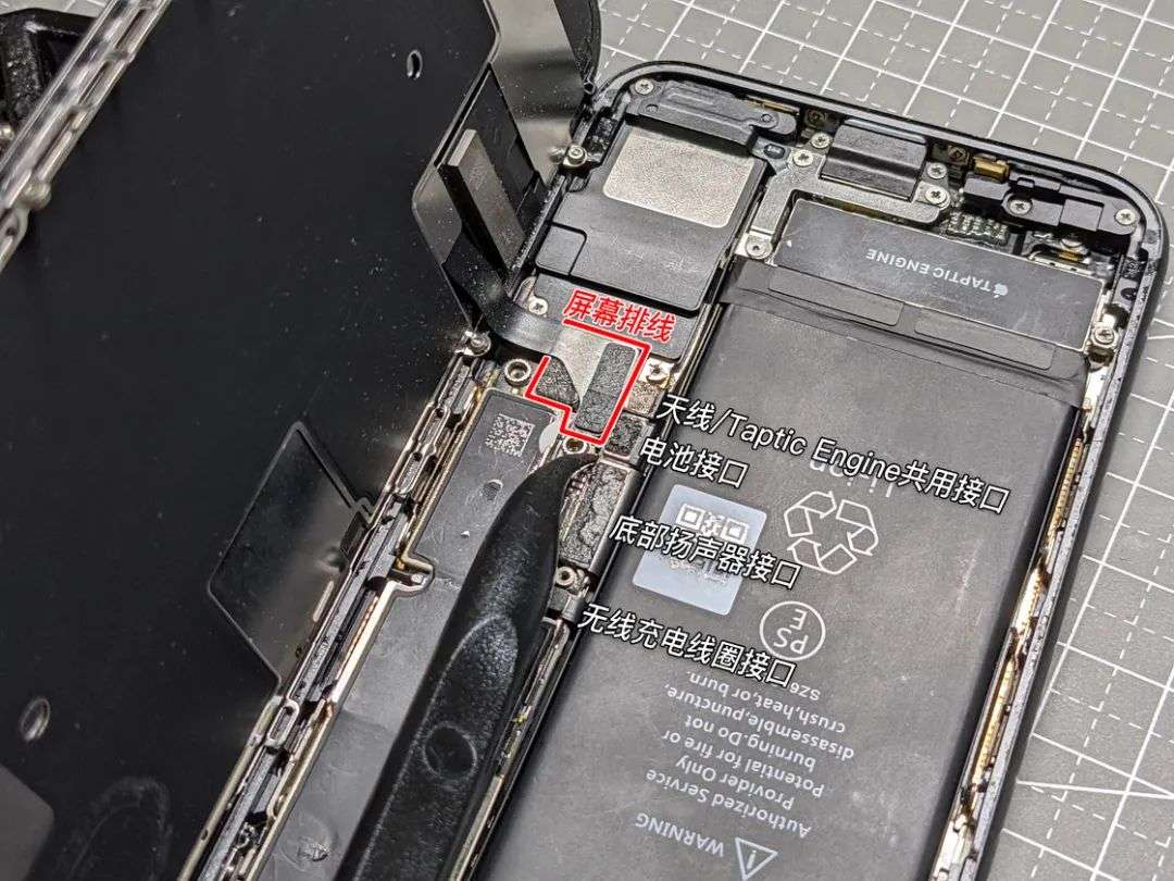 从 iPhone 7 开始,得益于主板接口的集中度提高, iPhone 的屏幕排线改为了侧面固定,屏幕分离不再像是掀起引擎盖那样垂直的打开,而是像翻书一样的侧开。