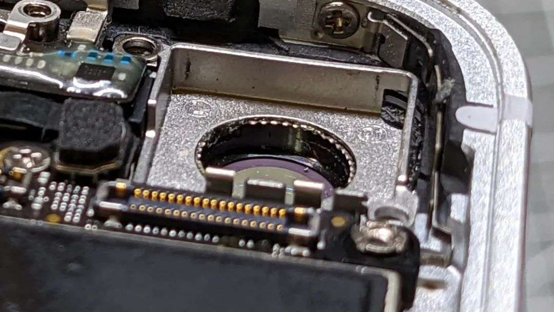 相机模组被一片由两颗无磁螺丝固定的方形盖板压在下面,这样的螺丝旨在避免对镜头的光学防抖系统产生干扰,可以直接用镊子夹出来,镜头模组本身则需要用塑料撬棒在旁边推一推才能顺利移出。随后卸下镜头模组左侧的 Wi-Fi 天线以及右侧边框上的蓝牙/NFC 天线,以及两颗主板螺丝之后,主板的上部便完全松开、可以轻微移动了。这个时候 Wi-Fi 天线下面、被主板部分压住的负责固定闪光灯与摄像头麦克风的金属盖板可能会自行滑落,要注意收纳和零件的叠放顺序。