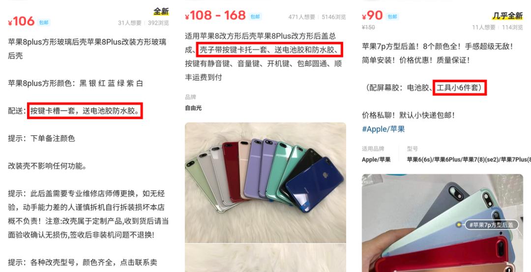 虽然类似的后壳总成可以很容易地在比如闲鱼之类的电商平台搜索到,但是一部分商家提供的其实是对于这些第三方 DIY 后壳的「寄修业务」,也就是需要把手机邮寄给他们、更换好之后再将整机寄回来的服务。这样的购买方式虽然比较繁琐,但是对于没有自己动手的经验、仅仅想尝试一下不同手感的人来说也是相对更安全的选择。但如果你想要自己动手的话,可以选择那些直接卖总成的卖家,仔细根据自己的机型准备所需的各类工具,以免陷入「巧妇有米无炊」的困境。