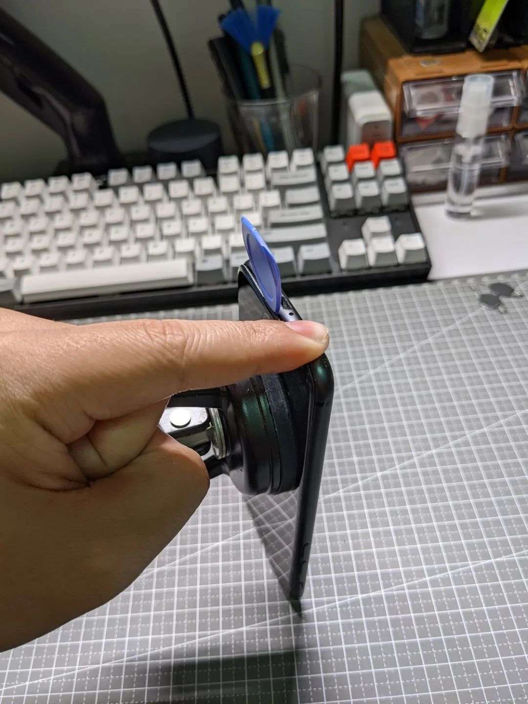 当使用足够的热量软化粘胶之后,就可以配合着手中的吸盘和三角撬片,从 Home 键一侧逐渐抬起屏幕,插入撬片防止闭合,然后用另一块撬片或者某些工具中附赠的软塑料卡沿着边框依次划开另外三边:尽量用撬片的厚度垂直地将屏幕与边框撑开,而不是真的将撬片塞进去通过杠杆原理武德充沛地把屏幕支架「挑」起来。
