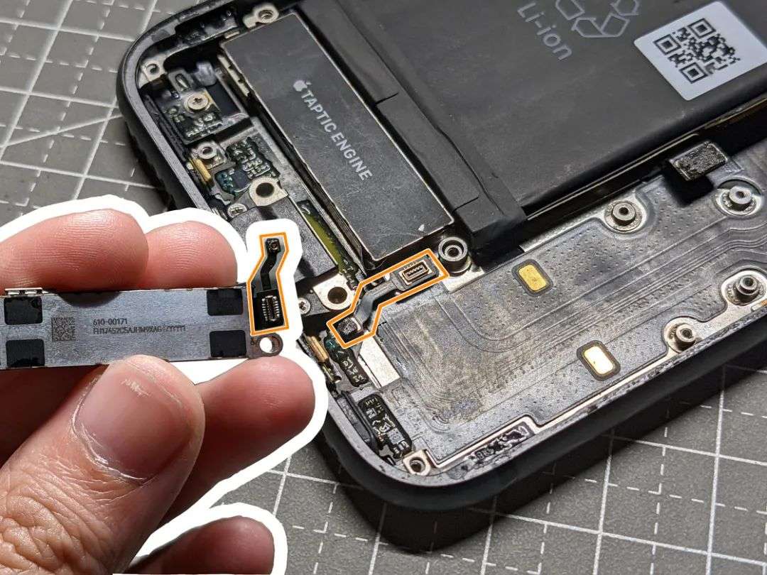 被压在一片反「L」形状的盖板与两颗十字、一颗三点螺丝下面的就是扬声器与 Taptic Engine 与 Lightning 接口的连接处了。底部扬声器作为除了主板与电池之外体积最大的零件,向外延伸了五颗螺丝固定与一根排线,需要格外留意这些螺丝的位置与安装顺序。同时由于扬声器尾部还与扬声器开孔的塑料片之间有粘胶,应该尽量在断开所有连接之后向摄像头方向「抽」出底部扬声器。
