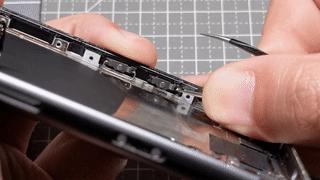 此时再依次挑开屏幕总成连接着主板的三个 BTB (Board To Board)接口,屏幕就从机身上分离了。此时你可以根据手中屏幕的状态决定是否需要更换屏幕,如果需要更换的话,取决于购买的屏幕总成的完整度,你可能需要拆下旧屏幕上面的屏幕支架、 Touch ID 模组甚至是整个听筒模组并转移到新的屏幕上。
