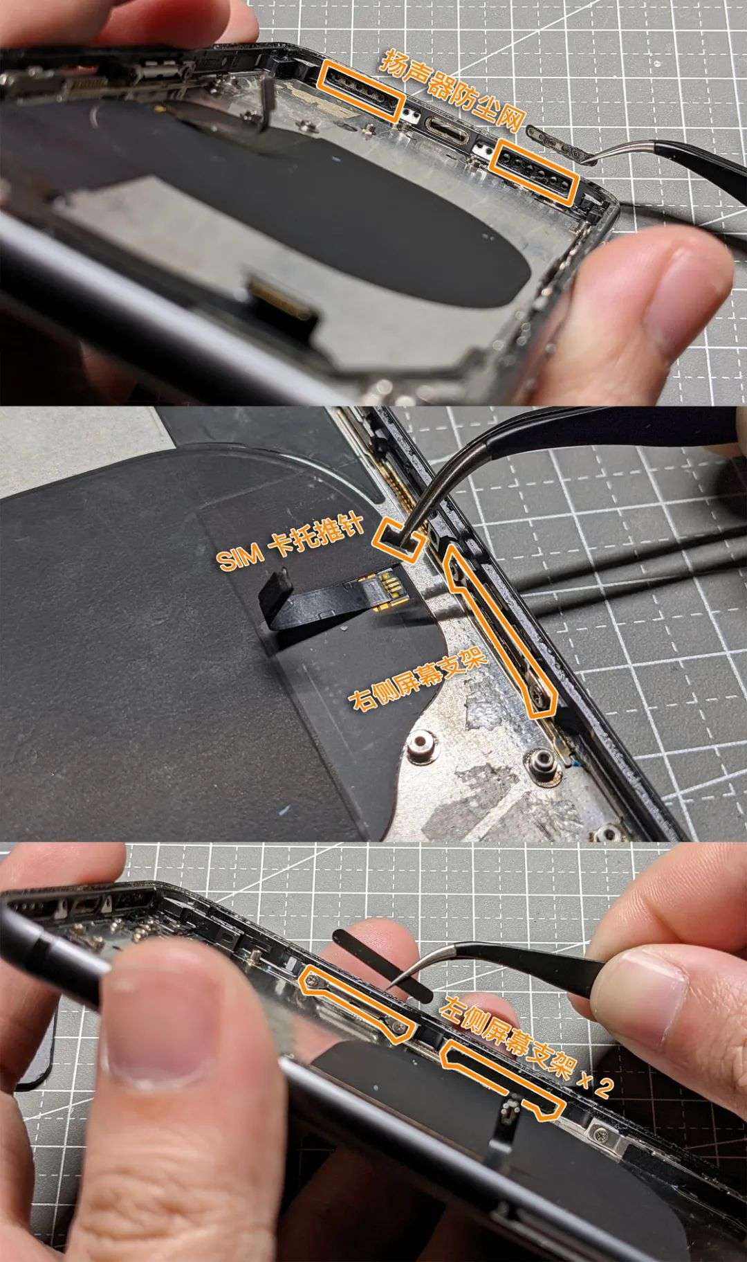 天线的拆解没有什么技巧,按照叠放的顺序依次拆下机身左上角的两层 GPS 天线,以及下面盖住电源 / 音量键排线的 BTB 接口的盖板,在收纳垫上按照顺序放好即可。