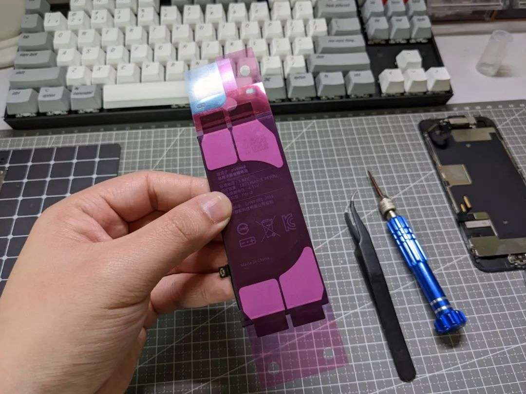 不过即使临近功成,贴电池依然是一门讲究的手艺。你拿到手中的电池胶应该是这样一个被蓝色、红色和粉色的塑料膜夹住的形态,在与机器和电池比好位置之后,蓝色膜应该朝向屏幕、同时蓝粉之间的红色膜应该朝向机身上方。