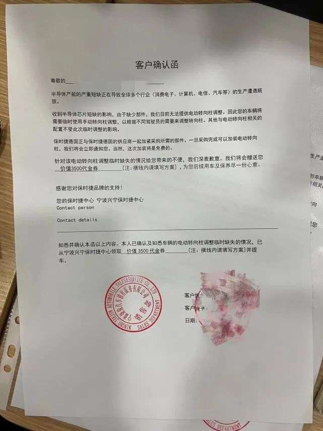 “去年5月份我花了150万定了一辆带有‘电动转向柱’配置的卡宴,但去年12月中付完全款提车时,保时捷销售却告诉我,因为芯片短缺暂时将新车的电动转向柱换成手动转向柱。当时他们承诺后期会将手动转向柱免费补装成电动的。”卡宴车主张磊(化名)向时代财经表示。