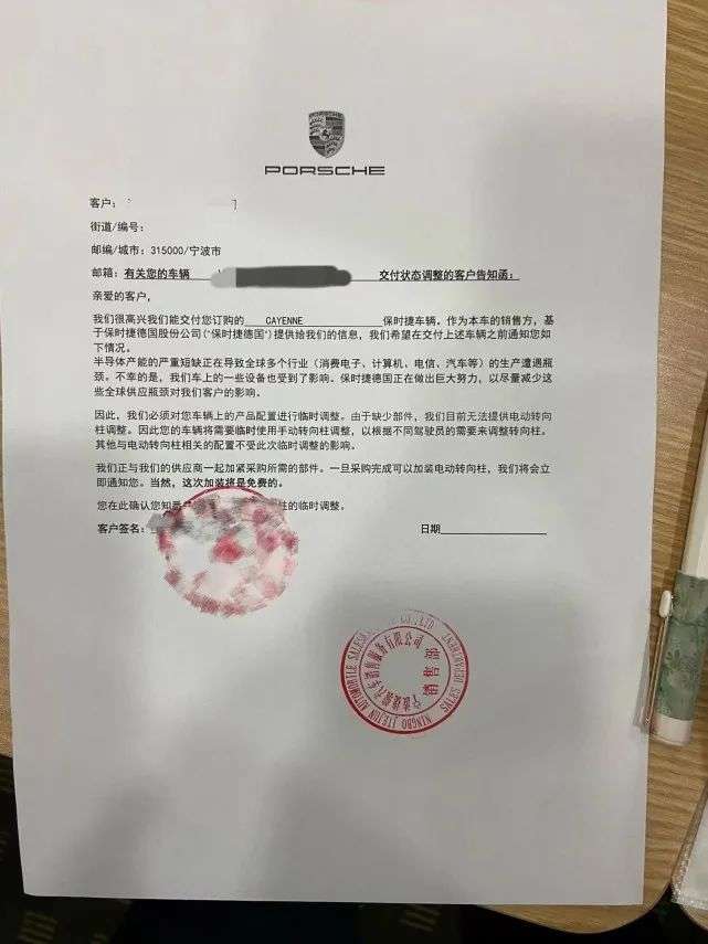 无独有偶。与张磊有相同遭遇的李强向时代财经表示,自己花165万元在2021年3月定了一辆标配带有电动转向柱的帕拉梅拉,去年10月提的车。但在等车的7个月时间里,一直无人告知交付的新车会缺少电动转向柱,直到付完款提车的时候才被告知这一配置暂时没有,后期免费补装。