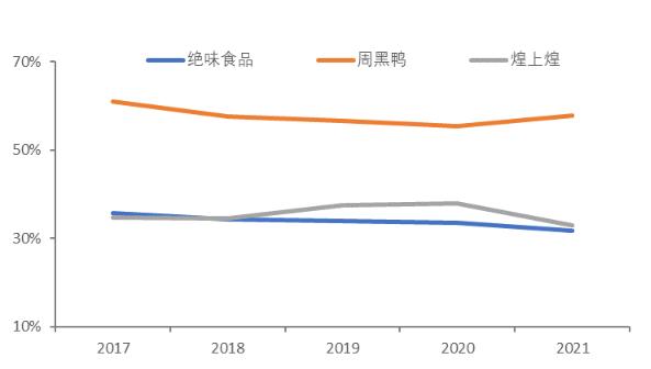 分销售渠道来看,在国内疫情反复的影响下,卤味市场线下渠道销售收入承压,线上渠道的铺设显得尤为重要。相较于重视线上渠道的周黑鸭和煌上煌,绝味食品的线上收入十分逊色,其线上销售渠道营收占比仅为2.01%,而周黑鸭和煌上煌通过布局外卖及社区生鲜电商等,二者的线上营收占比分别达到32%、21.4%。