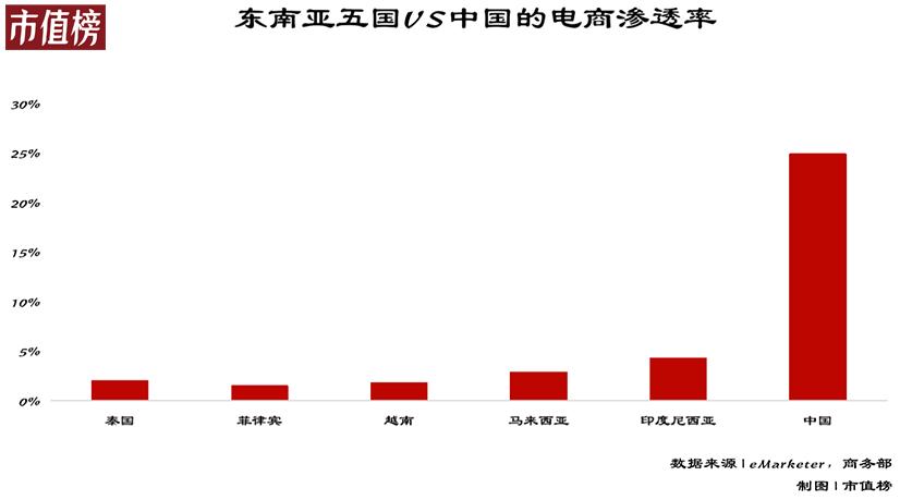 他们过去彼此之间的竞争、他们在中国曾遇到过的竞争,很可能会在东南亚市场重演一次,而且是以更激烈的姿态——除新加坡外,目前东南亚零售电商渗透率均低于5%,相比之下,中国是24.9%。