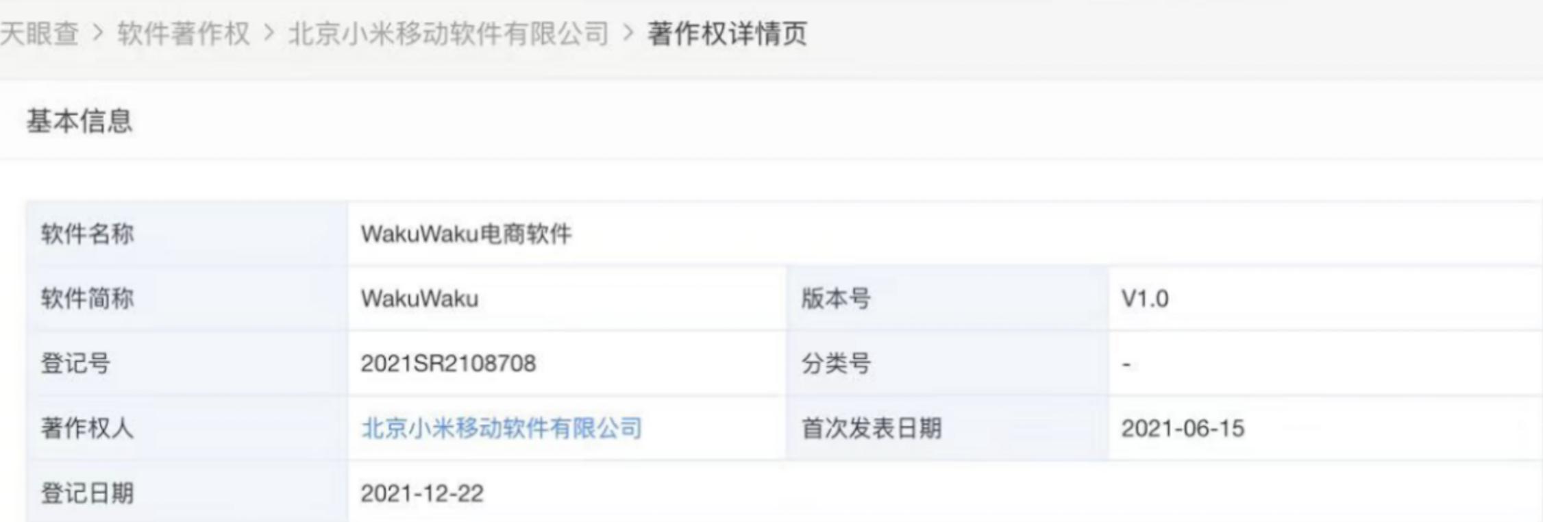 据企查查著作权一列披露,2021年6月15日“WakuWaku电商软件”的著作权被首次发表,2021年12月22日,北京小米移动软件有限公司对“WakuWaku电商软件”进行了著作权登记。