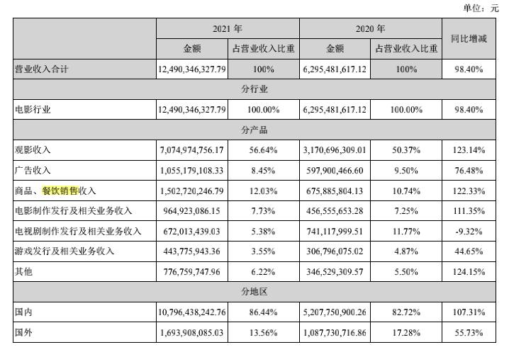 4月28日,万达电影股份有限公司发布2021年年度报告。报告期内,公司实现营业收入124.9亿元,同比增加98.4%。其中,商品、餐饮销售收入为15亿,毛利率达63.49%。
