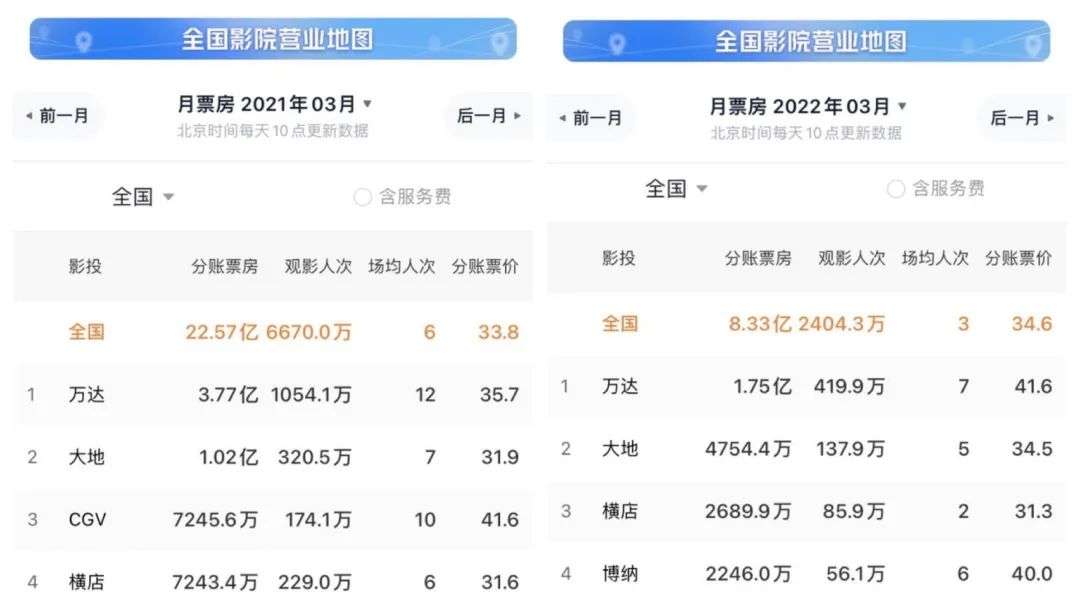 虽然万达在2021年的净利润实现扭亏为盈,但2022年第一季度业绩却比较惨淡。灯塔专业版数据显示,万达电影今年3月的国内分账票房仅有1.75亿元,仅有去年同期的一半。