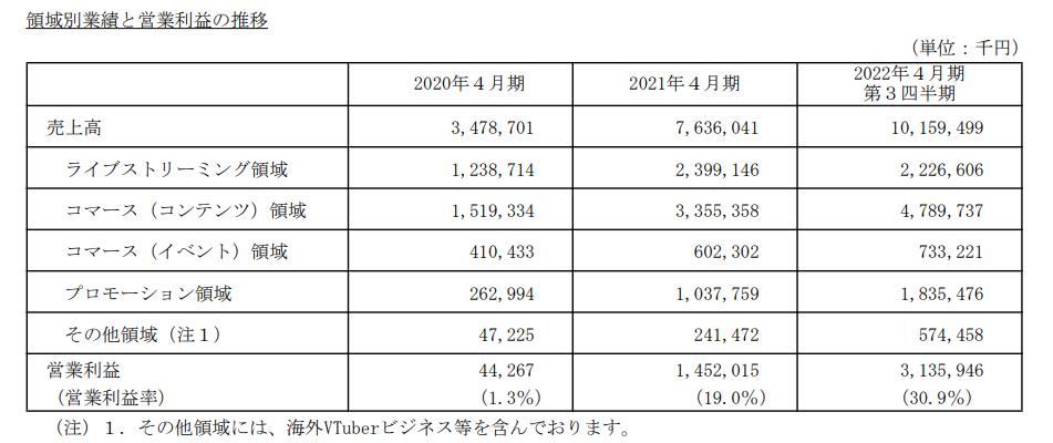 直播收入排第二,同期带来营收22.3亿日元,该部分包含YouTube直播打赏、会员费等;广告宣传18.4亿日元,包含艺人拍摄杂志、广告的出场费及IP许可费等。其他事业则包含了海外业务的营收情况——也就是和vox一样面向国际市场的NIJISANJI EN项目所属艺人带来的收入等。该部分目前占比最低,但其作为新业务,上一个完整财年营收相比前年,同比增长511%,增速在四个业务中最快。