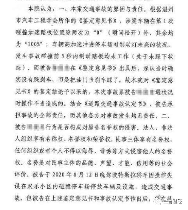 去年10月,温州市鹿城区人民法院下达民事判决书,就温州车主陈某在社交平台上讲述因特斯拉刹车失灵导致发生碰撞事故一事做出判决。