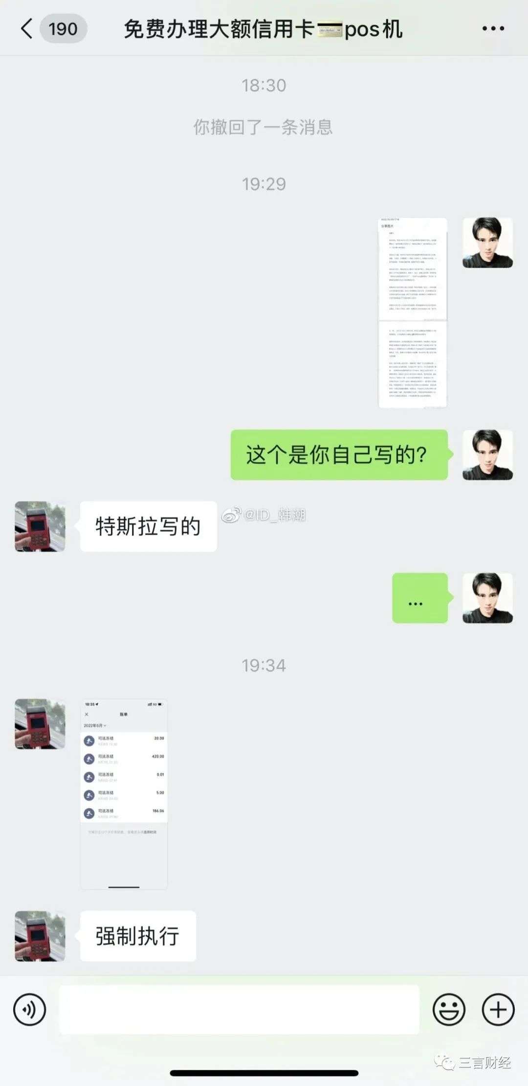 截图显示,韩潮问对方这封道歉信是否为其亲笔所写,对方则答复称是“特斯拉写的”,并且还发给韩潮一张帐单截图,上面显示多条司法冻结信息。