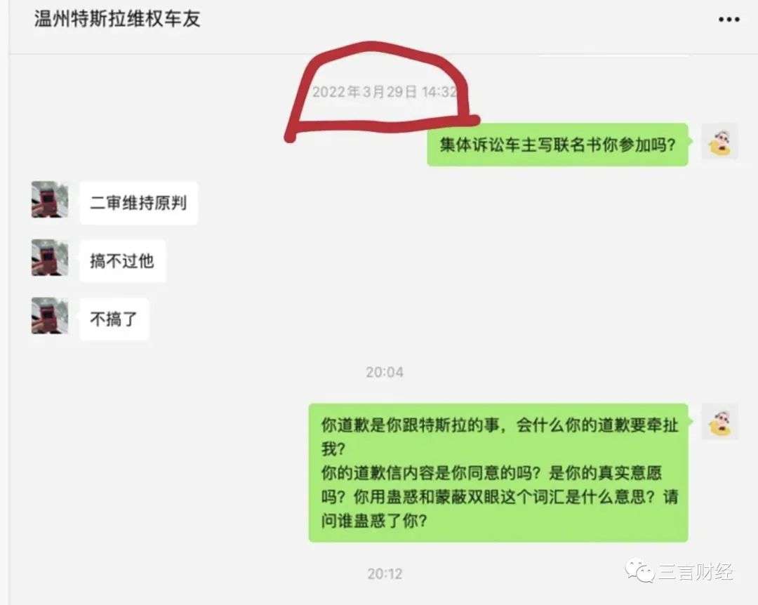 2022年3月29日,张女士曾询问陈某是否参加车主联名集体诉讼,对方回复称“二审维持原判,搞不过,不搞了”。