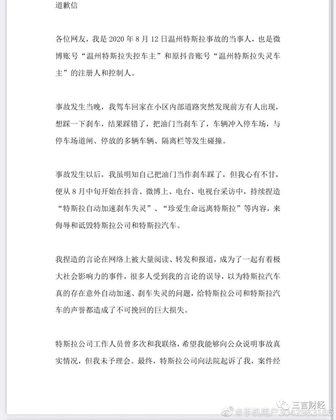 昨日,温州特斯拉失控车主陈某发布道歉信,承认自己捏造“特斯拉自动加速刹车失灵”等言论。