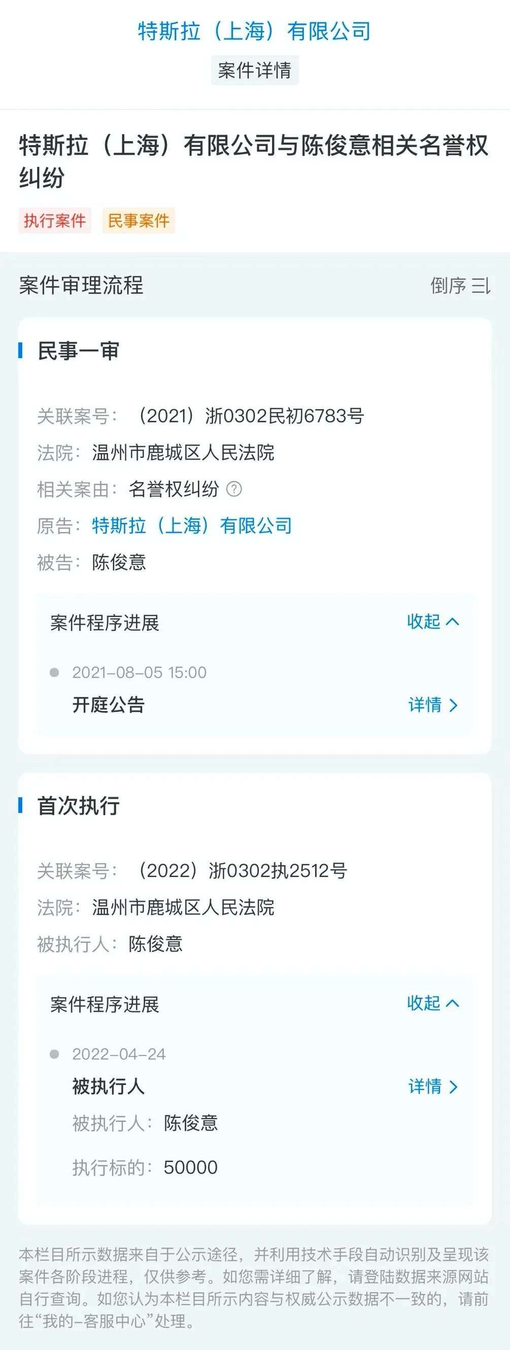 法院判定,陈某构成了对原告(特斯拉上海有限公司)名誉权的侵害,要求被告在抖音平台上向原告赔礼道歉,并酌情向原告赔偿损失5万元。