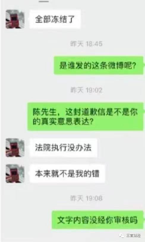 另一个聊天记录显示,有人问陈某道歉信是不是其真实意思表达。陈某回复称,“法院执行没办法,本来就不是我的错”。