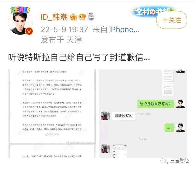 随后,特斯拉“退一赔三”案涉事车主韩潮发微博称“听说特斯拉自己给自己写了封道歉信”。