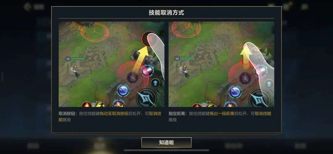 并且,在《英雄联盟手游》中还有两种不同的技能取消机制,一是拖动到屏幕右上角的“X”键,二是拖动到技能施法范围之外。