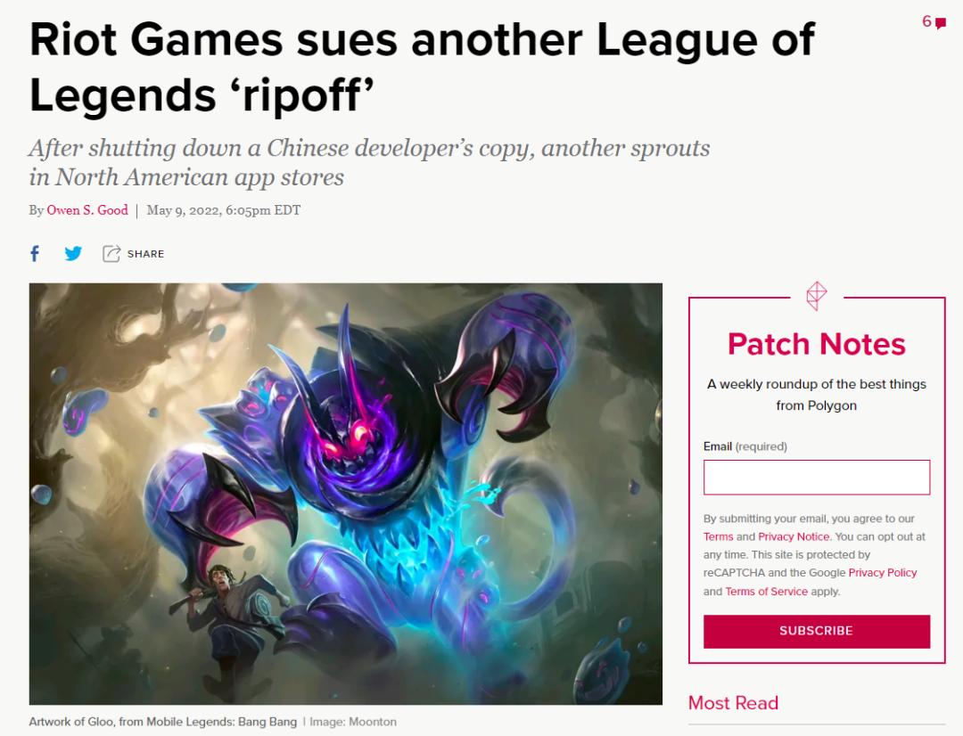 在拳头提交的诉讼书中,有数十条《MLBB》涉嫌抄袭《英雄联盟手游》的例子,其中大致可以分为三类:游戏机制,英雄形象以及宣发物料。