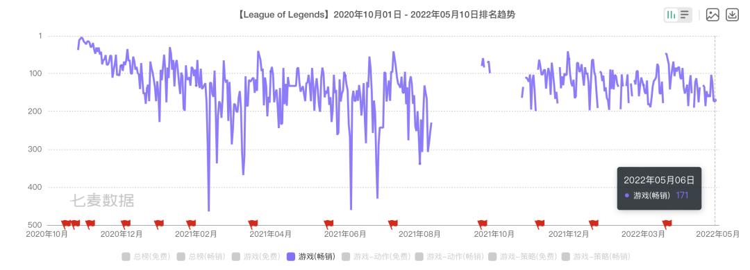 反观《英雄联盟手游》虽然有着端游IP的加持,但在东南亚地区的首战却依然落于下风。从榜单成绩上看,游戏的排名波动较大,处于Top100到200区间,表现不如《MLBB》稳定。