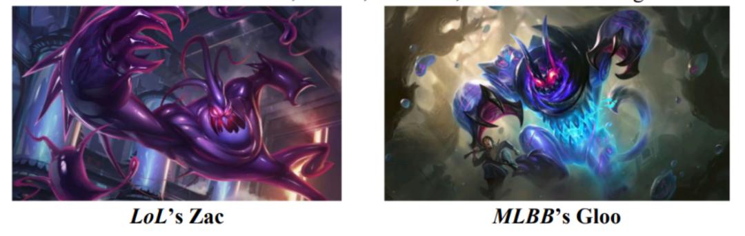 例如,拳头在2013年发布的“Zac”和沐瞳2021年发布的“Gloo”。这两者都有着相同的配色方案、体型结构以及“爪子”形态,并且在游戏中也有着相似的攻击属性和技能效果。