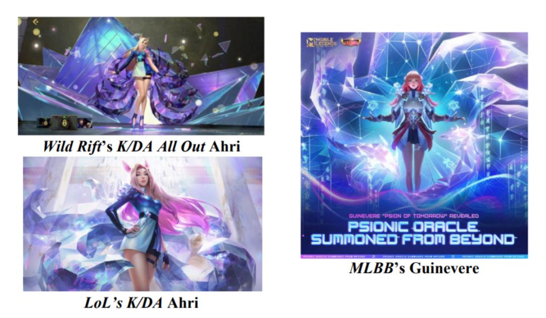 不仅如此,在外在皮肤形象上,《MLBB》也有很多相似的痕迹。例如,英雄“Guinevere”的皮肤有着与KDA“Ahri”相同的配色方案以及水晶尾巴元素。