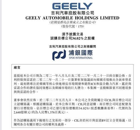 吉利汽车发布公告称,与雷诺韩国汽车签订股份认购协议,同意以13.76亿元认购雷诺韩国汽车4537.5万股股份(占比34.02%)。其实,早在今年1月,双方母公司吉利控股集团与雷诺集团就正式签订了框架协议,基于吉利CMA模块化架构,使用吉利混动技术,向韩国市场推出全新混动技术及车型。
