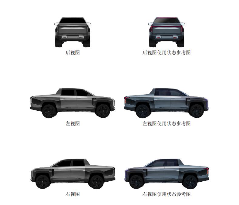 从当时的渲染图来看,该皮卡设计风格采用了美式皮卡常见的方正凌厉式前脸设计元素,方向盘和中控大屏等设计更倾向于乘用车。与之相比,此次曝光的皮卡外观设计专利图多了科技感和未来感,颇有“硬刚”特斯拉电动皮卡Cybertruck的意味。