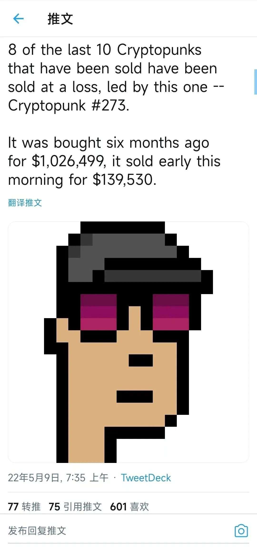 据报道最新出价和销售情况的Twitter账户CryptoPunks Bot称,最近10个已售出的Cryptopunk中有8个是亏本出售,其中以Cryptopunk #273为首。