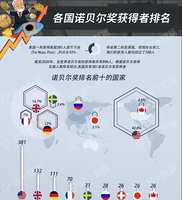 截至2020年,全球诺奖得主共计896人,美、英、德位列前三,日本也有26枚诺贝尔奖,中国的诺奖得主只有3人,分别是杨振宁、莫言以及屠呦呦。