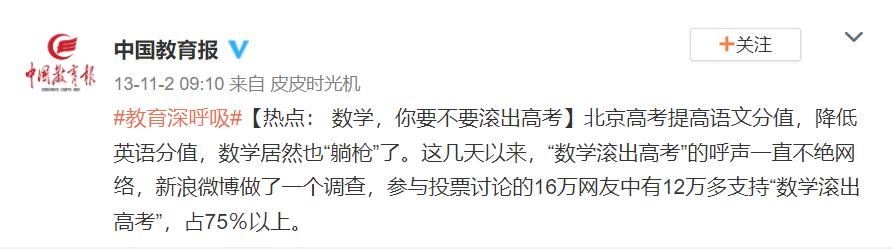 2013年新浪微博发起的一项调查中,16万参与投票的网友,有12万人支持“数学滚出高考”。